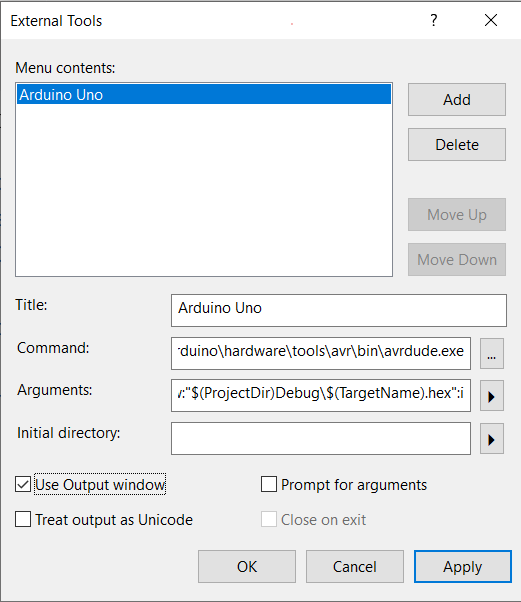In Arguments wird für einen Arduino Uno der folgende Befehl geschrieben. Der Pfad zu avrdude.conf und der passende COM-Port sollten angepasst werden. TargetName kann durch ItemFileName ersetzt werden, falls notwendig.