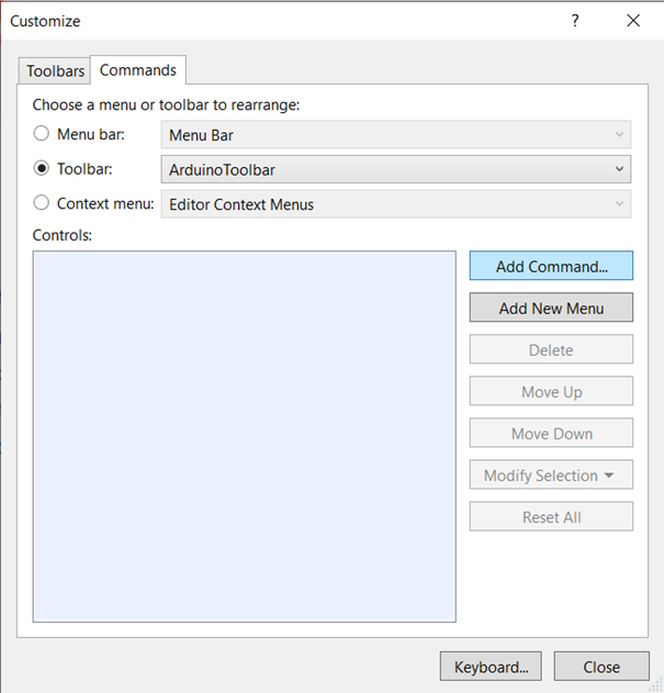Im Tab „Toolbars“ wird ein neuer Eintrag mit „New“ hinzugefügt. Der Name kann beliebig gewählt werden, beispielsweise „ArduinoToolbar“.