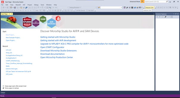 Nun befindet sich rechts in der Menüleiste ein Button namens „Arduino Uno“ mit dem vorher konfigurierten AVRdude-Tool.