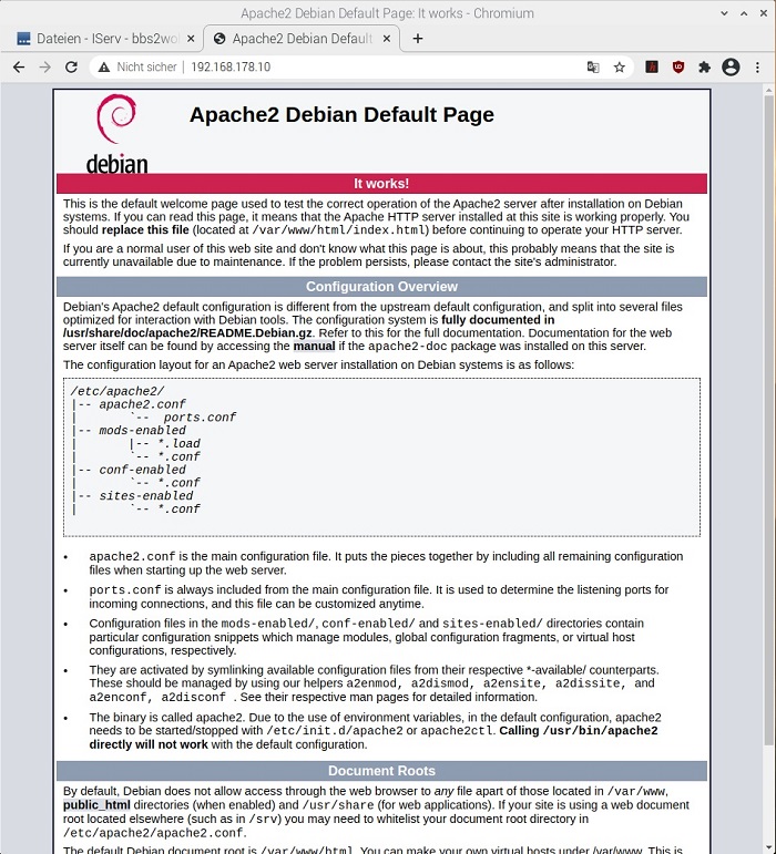 Es muss wie immer mit "J" bestätigt werden, dass die Datein gespeichert werden dürfen. Das war´s auch schon. Über den Browser (Chromium auf dem RPI) oder einen Rechner aus dem selben lokalen Netzwerk sollte nun unter der vergebenen IP-Adresse die Apache2-Standardseite sichtbar sein.