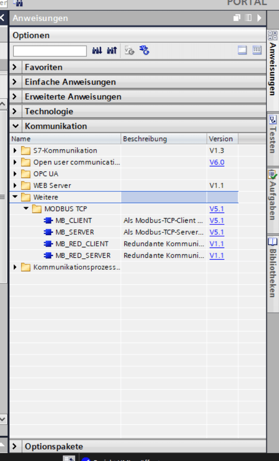 Nachdem der Funktionsbaustein erstellt wurde, wird dieser nun gefüllt. Hierzu wird der "MB_Client" verwendet. Dieser ist auf der rechten Seite im Reiter Anweisungen unter dem Punkt Kommunikation --> Weitere --> Modbus TCP --> MB_Client zu finden (siehe Abbildung 2). Ziehen Sie diese Anweisung einfach per Drag & Drop in das erste Netzwerk des Funktionsbausteins. Wichtig ist hierbei, dass sie diese Anweisung als Multiinstanz einbinden.