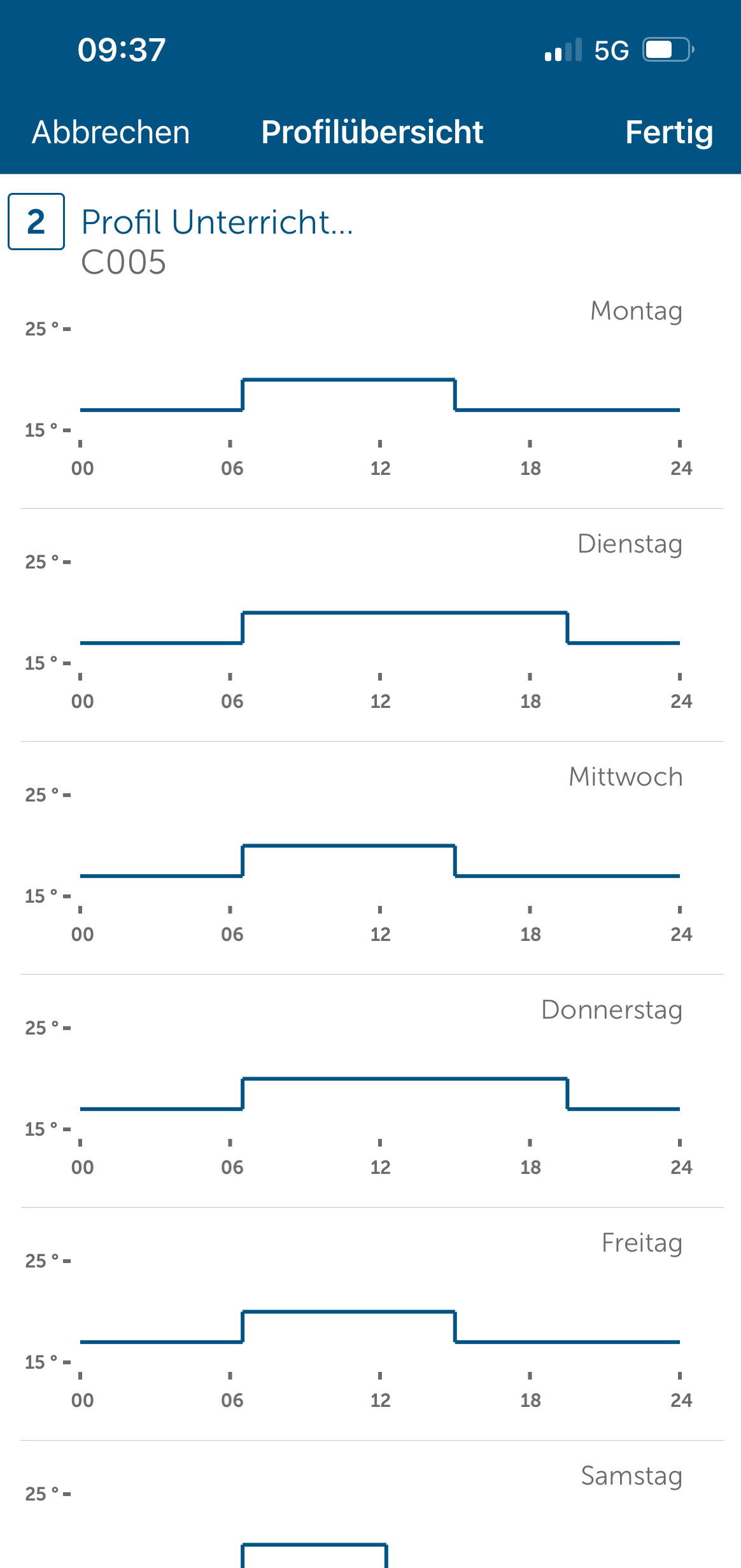 Nach erfolgreichem Anlernen der Thermostate kann über die App für jeden Raum das Standardprofil angepasst werden. Alternativ können neue Temperaturprofile erstellt werden, um bei einer sich ändernden Raumnutzung einfach wechseln zu können. In unserem Testlauf haben wir zum einen das Standardprofil so angepasst, dass es beispielsweise während der Ferien genutzt werden kann und nur einem Frost- beziehungsweise Schimmelschutz dient. Zusätzlich haben wir außerdem ein eigenes Profil für den Raum erstellt analog zum Unterrichtsplan im Raum C005. Dabei variieren wir zwischen 20 Grad und 17 Grad Celsius. Dieses Profil könnt ihr unten auf der Seite sehen. Im Sonderfall kann die Temperatur immer über das Raumthermostat an die Bedürfnisse angepasst werden, beispielsweise bei einer Sonderunterrichtsstunde am Wochenende oder ähnlichem.
