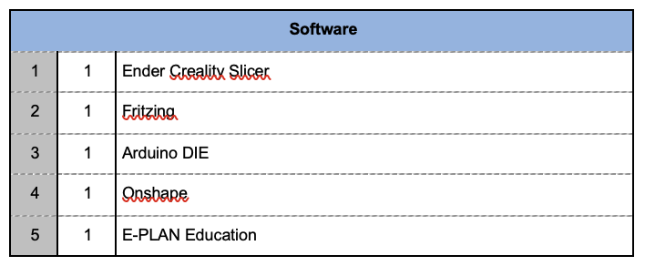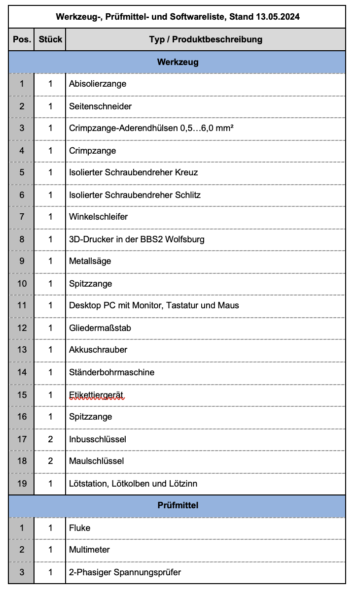 Tabelle 4: Werkzeug-, Prüfmittel-, Softwareliste