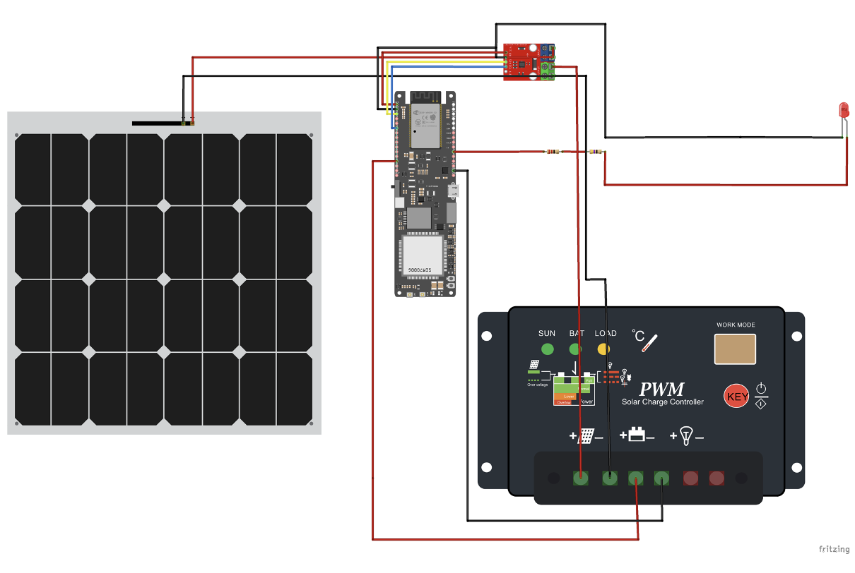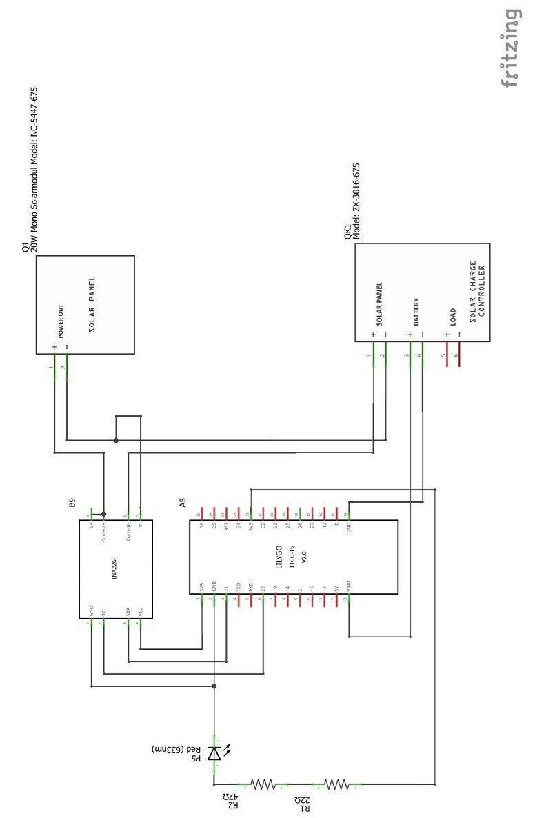 Der Schaltplan für den ESP32 mit der Software Fritzing visualisiert die Verkabelung und Komponentenanordnung und Integrierierung des INA226 Sensor. Bei der Verdrahtung wurde sich für eine stromrichtige Messmethode entschieden, da diese Methode eine genauere Strommessungen und minimierte Spannungsabfälle erlaubte, was die Leistung des Solarpanels effektiver überwachte.
