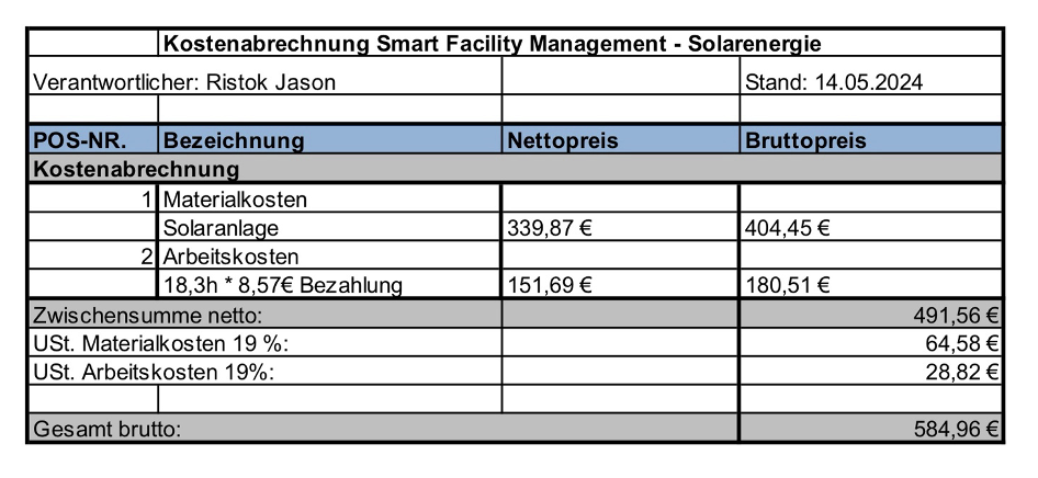 Zudem soll eine Kostenkalkulation basierend auf dem Zeitplan und der Materialliste durchgeführt werden, um das Budget zu überwachen und finanzielle Überschreitungen zu vermeiden.