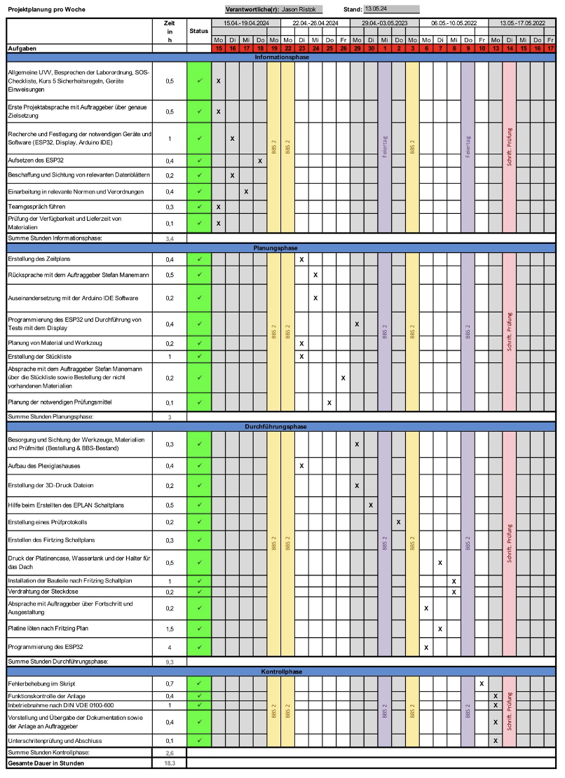 Um das Projekt so nah wie möglich an dem Ursprungsprojekt zu richten, wird empfohlen sich an dem folgenden Zeitplan, der Materialliste und der Liste der benötigten Werkzeuge zu halten.