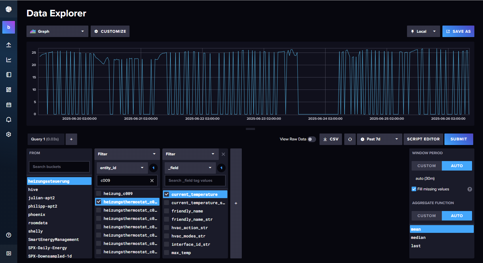 Damit das System langfristig überwacht und optimiert werden kann, ist es notwendig, bestimmte Daten wie Temperaturverläufe, Raumbelegungen und Heizbefehle zu speichern. An unserer Schule ist bereits eine InfluxDB-Datenbank auf einem Strato-Server eingerichtet. Daher liegt es nahe, auch die Daten unseres Systems dort zentral zu erfassen. Der Administrator des Servers hat uns alle notwendigen Zugriffsrechte erteilt, sodass wir die Anbindung eigenständig vornehmen können.
