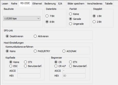 Um die Kommunikation der Kamera einzustellen, gehen Sie auf die Registerkarte [RS-232C]. Hier müssen Sie die "Baudrate", die "Datenbits", die "Parität", die "Stoppbits", die "Kopfzeile" und den "Begrenzer" so einstellen, dass sie zu Ihrem verwendeten PC bzw. Ihrer SPS passen.