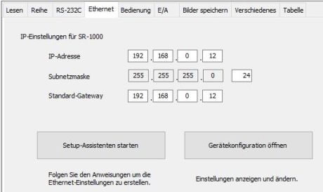 Des Weiteren müssten Sie in dem Reiter [Ethernet] die entsprechende IP-Adresse, Subnetzmaske und das Standard-Gateway eintragen. Klicken Sie nun auf "Setup-Assistenten starten" und befolgen Sie die Bildschirmanweisungen zur Konfiguration der Kommunikationseinstellungen.