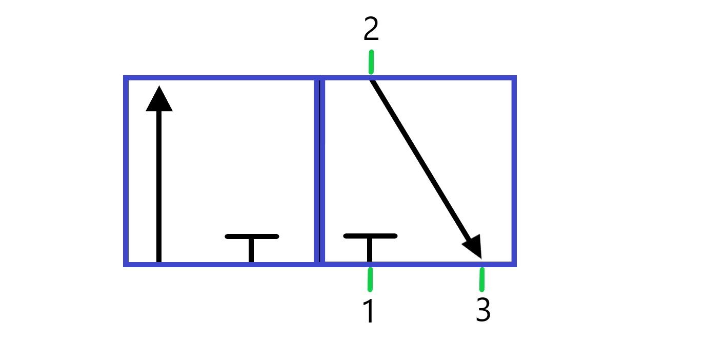 Das Wegeventil hat drei Anschlüsse, die grün markiert sind und besteht aus zwei Arbeitspositionen (Quadrate), die lila markiert sind.