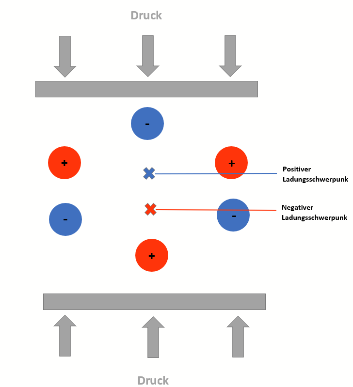 indem durch Druck auf einen Kristall eine Verschiebung der Ladungsschwerpunkte erzeugt wird. Diese