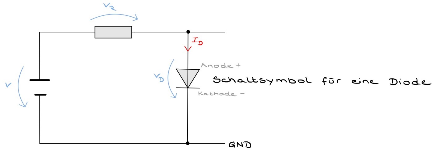 Die 5 V werden über den errechneten Vorwiderstand an die Anode (das längere Beinchen) und GND (0 V) an die Kathode angeschlossen (siehe Schaltungsaufbau).