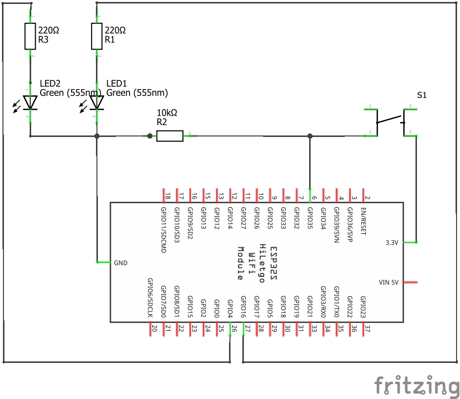 Um den bisherigen Aufbau um eine zweite LED zu erweitern, wird nicht sonderlich viel benötigt.