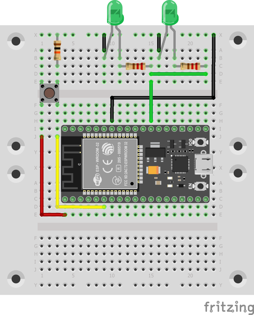 Um einen Pin zu sparen, kann es sinnvoll sein, LEDs parallel zu schalten. Dabei muss die maximale Stromstärke der Pins des ESP32 beachtet werden: