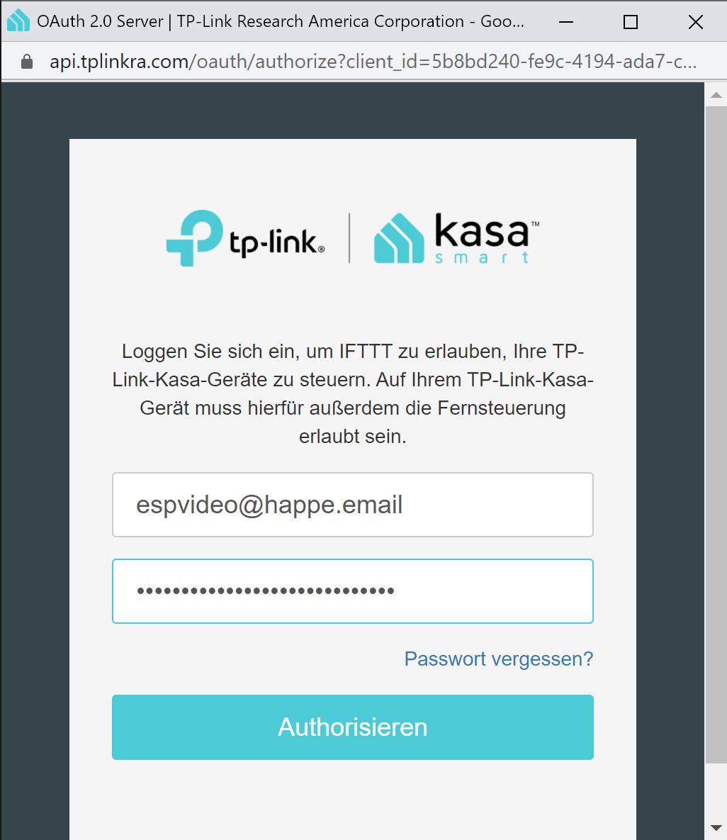 3. Nun baut IFTTT Kontakt zu eurem Konto bei TP-Link Kasa auf. Es ist daher zwingend erforderlich, dass ihr bei Kasa ein Konto eingerichtet habt. Ihr meldet euch nun also mit euren Daten an, welche ihr schon beim Eichrichten der Steckdose verwendet habt. Damit gestattet ihr IFTTT den Zugriff auf eure Geräte. Nur so ist es möglich die Steckdose zu Bedienen. Nachdem ihr eure Daten eingegeben habt, klickt ihr auf "Authorisieren".