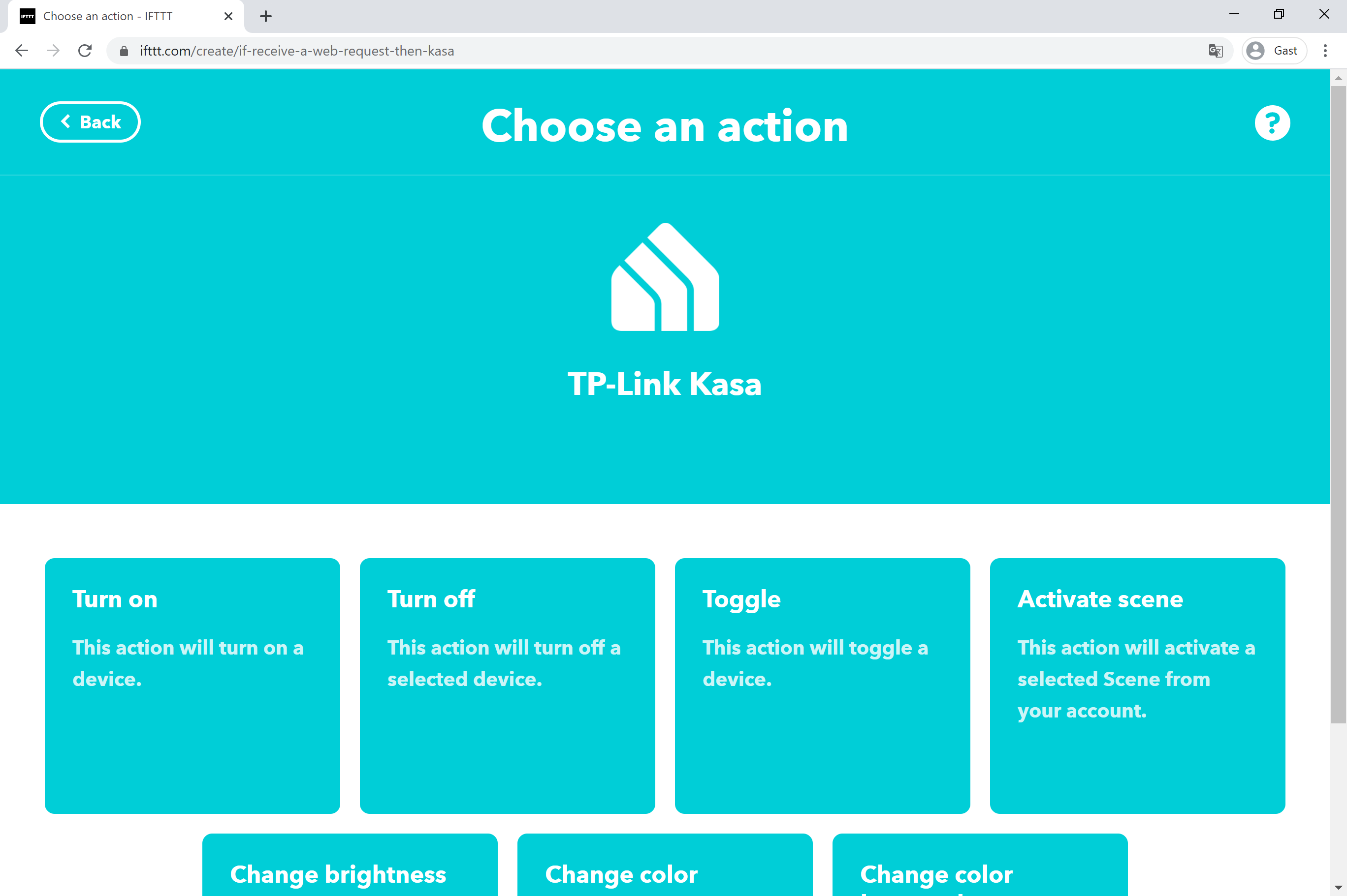 4. Es erscheint die Aktionsseite von Kasa. Hier sind alle Services aufgezählt, welche möglich sind. Neben einfachen An- und Ausbefehlen gibt es zum Beispiel auch einen Toggle-Modus, oder für smarte Glühbirnen Helligkeitseinstellungen. Wir wollen jetzt einen Einschaltvorgang realisieren und wählen "Turn On" .