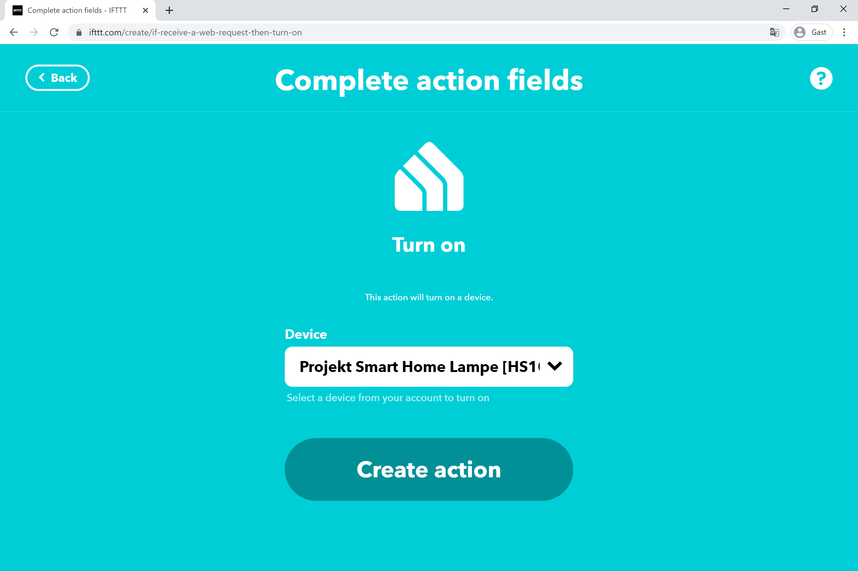5. Ihr werdet weitergeleitet und nun aufgefordert, ein Gerät auszuwählen. Wenn bei der Authorisierung und der Einrichtung alles funktioniert hat, müsste unter den Geräten nun der Name euerer Steckdose auftauchen. Den wählt ihr aus und geht auf "Create Action" .