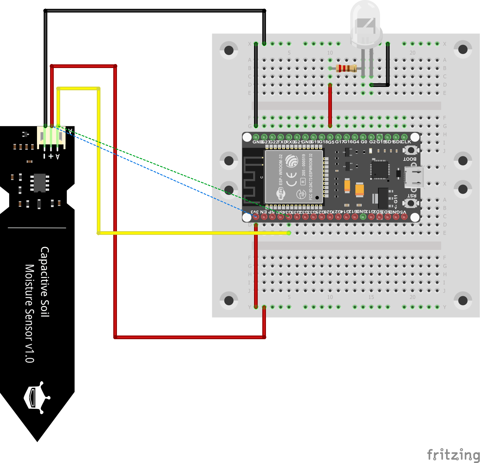 An einer freien Stelle der Platine wird nun die LED platziert. Je nach Typ der LED muss ein entsprechender Vorwiderstand gesteckt werden. Dabei muss beachtet werden, dass der Datenpin des Mikrocontrollers eine Spannung von 3,3 V ausgibt.