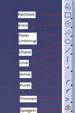 Du hast vielleicht schon bemerkt, dass sich die Funktionen in der rechten Toolbar verändert haben. Wenn du dich in der Skizzierebene befindest, hast du dich von der dreidimensionalen Ansicht in die Zweidimensionale begeben. Hier stehen dir auch dementsprechend nur zweidimensionale Konstruktionsmöglichkeiten (Linien, Kreis-, Rechtecksflächen, ...) zur Verfügung.