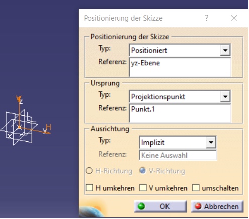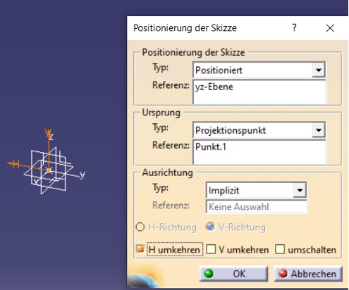 Nachdem du die Funktion ausgewählt hast, öffnet sich das unten abgebildete Menü, in dem die Lage und Position der Skizze über die Plane/Ebene und den ausgewählten Punkt geändert werden kann.