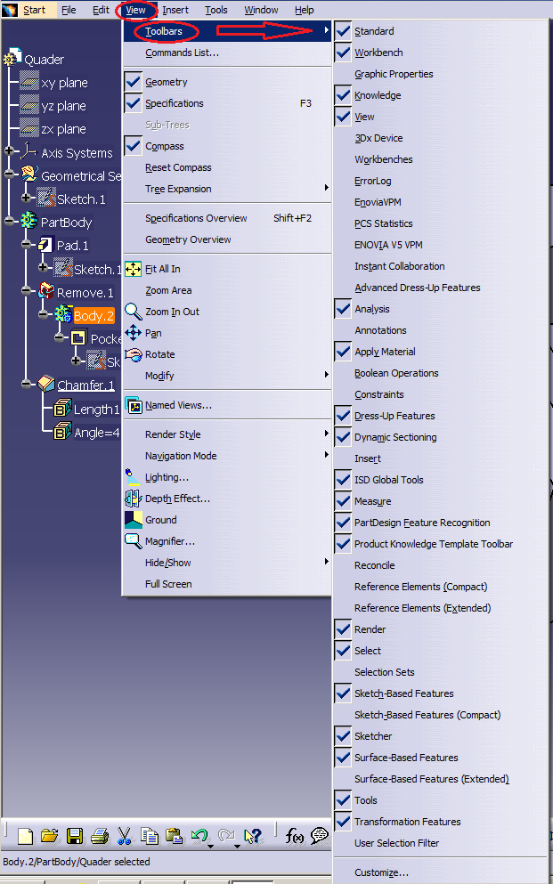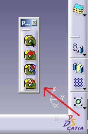 Während des Konstruierens in CATIA kann es vorkommen, dass einzelne Menüs nicht direkt über die Toolbar abrufbar sind. Oftmals reicht die vorhandene Toolbar von ihrer Größe nicht aus, um alle Bedienelemente darzustellen. Zum Teil lassen sich weitere Bedienelemente über die Pfeile herausziehen: