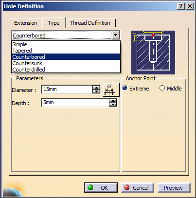 Die Form der Bohrung lässt sich unter "Type" einstellen. Die ausgewählte Form wird dabei immer in dem Bild rechts daneben angezeigt. Unter "Parameters" lassen sich die erforderlichen Parameter einstellen, welche für die jeweilige Form benötigt werden.