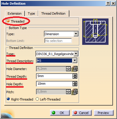 In diesem Reiter lassen sich nun noch weitere Einstellungen vornehmen. So kann die Art des Gewindes unter "Type" ausgewählt werden. In diesem Beispiel wurde ein Regelgewinde eingestellt. Nun kann das gewünschte Gewinde unter "Thread Description" eingestellt werden. Anschließend kann die Tiefe des Gewindes, sowie die Tiefe der Bohrung eingegeben werden.