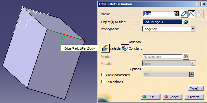 Oft sollen Körperkanten abgerundet werden. Um das zu realisieren, gibt es zwei Möglichkeiten. Zuerst können in der Skizze bereits Radien anstelle von Ecken eingefügt werden. Diese Möglichkeit entspricht jedoch nicht der üblichen maschinellen Bearbeitung. Damit das Programm erkennt, dass hier eine Kante abgerundet wurde, muss diese über den Befehl "Edge fillet" erzeugt werden. Als Ausgangskörper soll wieder auf den erzeugten Quader zurückgegriffen werden. Anschließend wird aus der rechten Toolbar die Funktion ausgewählt.