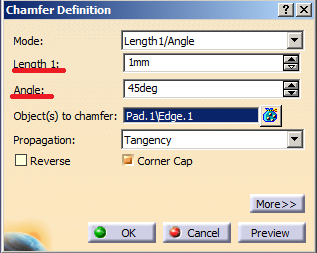 Auch hier öffnet sich ein Fenster mit den Einstellungen. Das Auswählen einer Kante funktioniert dabei analog wie bei der Rundung. Die Abmessungen der Fase können über verschiedene Wege eingegeben werde. Normalerweise entscheidet man sich für die Angabe in Länge und Winkel, wie es auch in technischen Zeichnungen üblich ist. Die passenden Maße werden in den Feldern darunter eingetragen. Anschließend kann auch dieses Fenster über "OK" wieder geschlossen werden