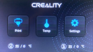 Nach dem Einschalten des Druckers öffnet sich der Startbildschirm, auf dem die drei Hauptfunktionen "Print", "Temp" und "Settings" untergebracht sind.