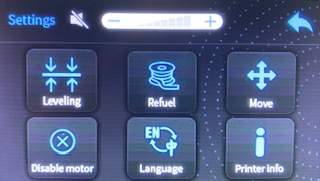 Der Reiter "Settings" beinhaltet die übrigen Einstellungen. Auf die Wichtigsten wird in den folgenden Kapiteln noch näher eingegangen. Hier kann die Düse manuell bewegt "Move" oder der Motor ausgeschaltet werden "Disable motor". Außerdem kann die Sprache eingestellt werden "Language" und die wichtigsten Informationen über den Drucker eingesehen werden "Printer info".