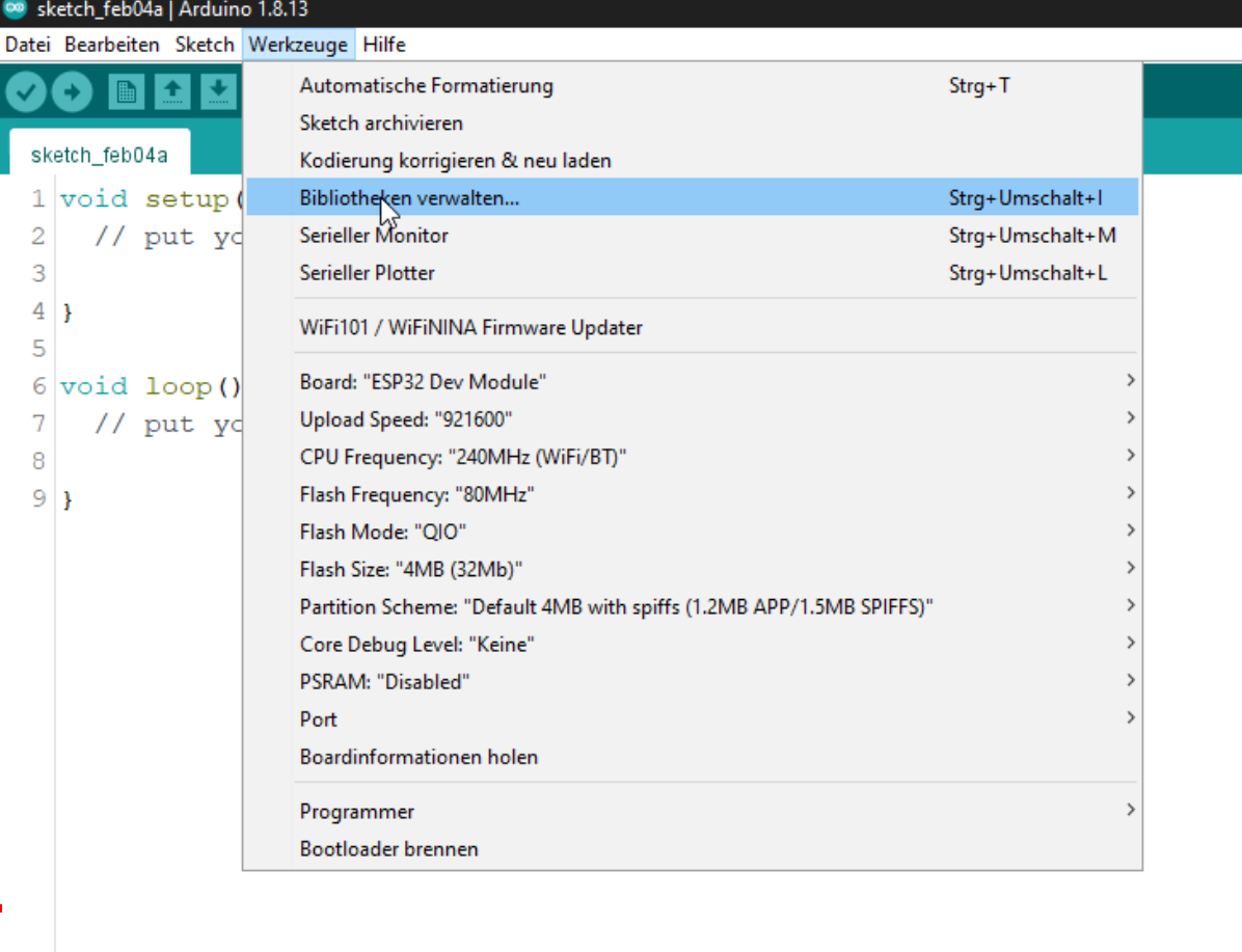Dazu wird in der Arduino IDE auf Werkzeuge --> "Bibliotheken verwalten..." geklickt.
