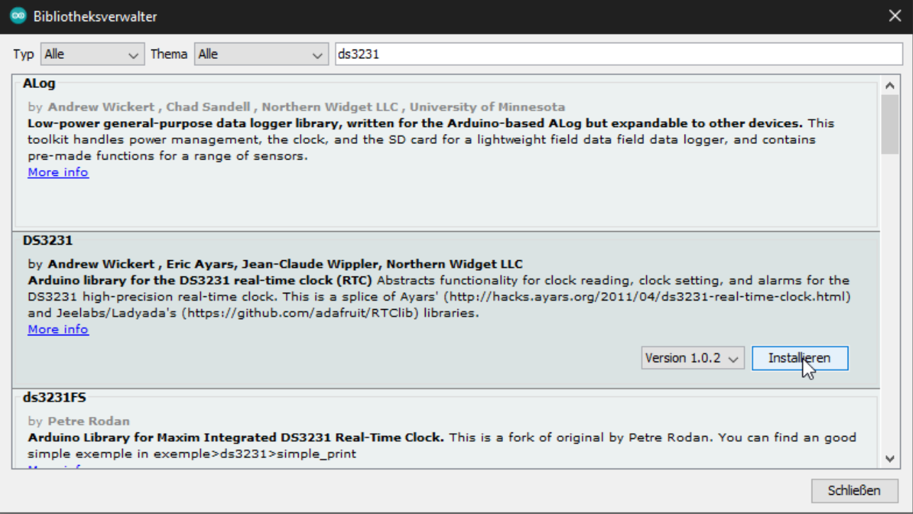 Danach wird in der Suchleiste “ds3231” eingegeben und installiert.
