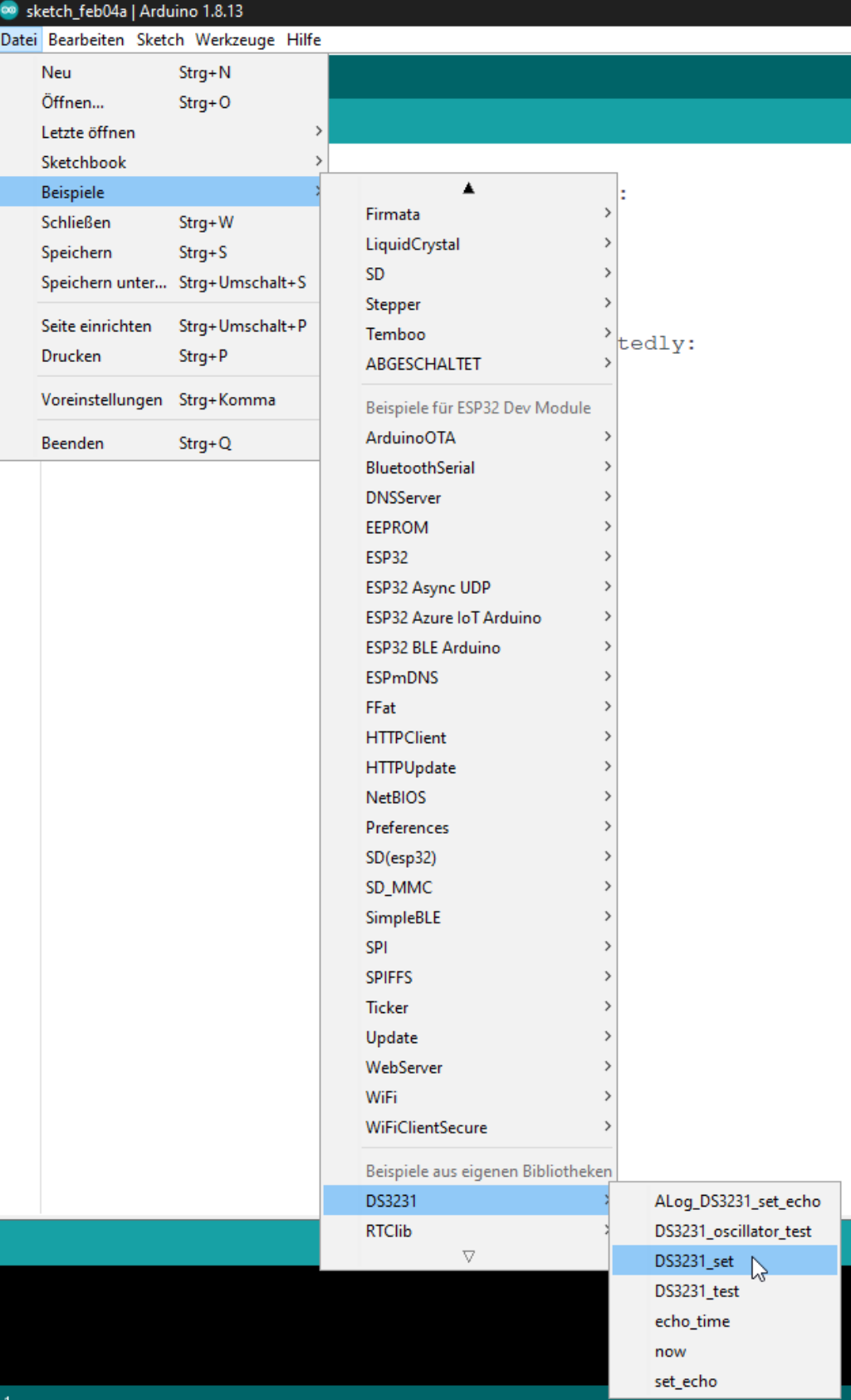 Nach der Installation der Bibliothek erstellen wir zunächst einmal den Beispielcode zur Einstellung der Zeit. Dafür geht man über Datei --> Beispiele und scrollt bis man zu DS3231 kommt. Zur Erstellung wird dann lediglich auf DS3231_set geklickt.