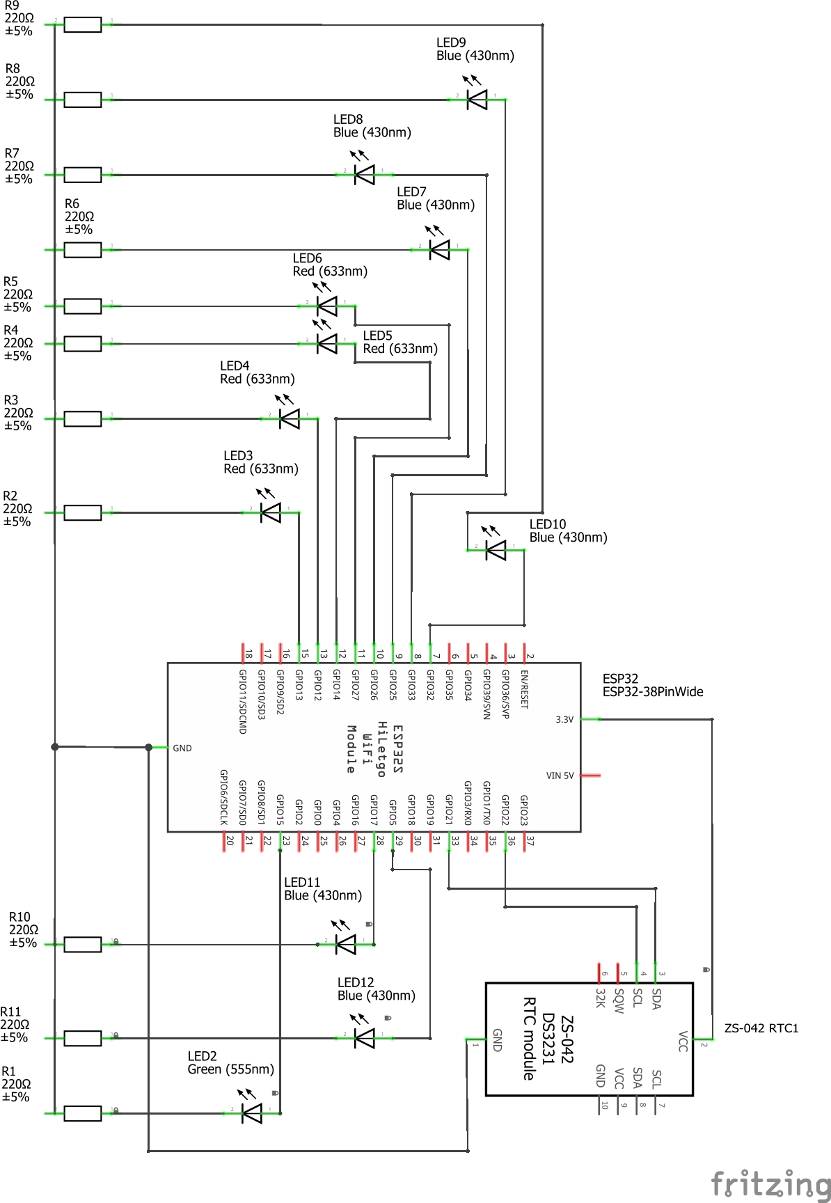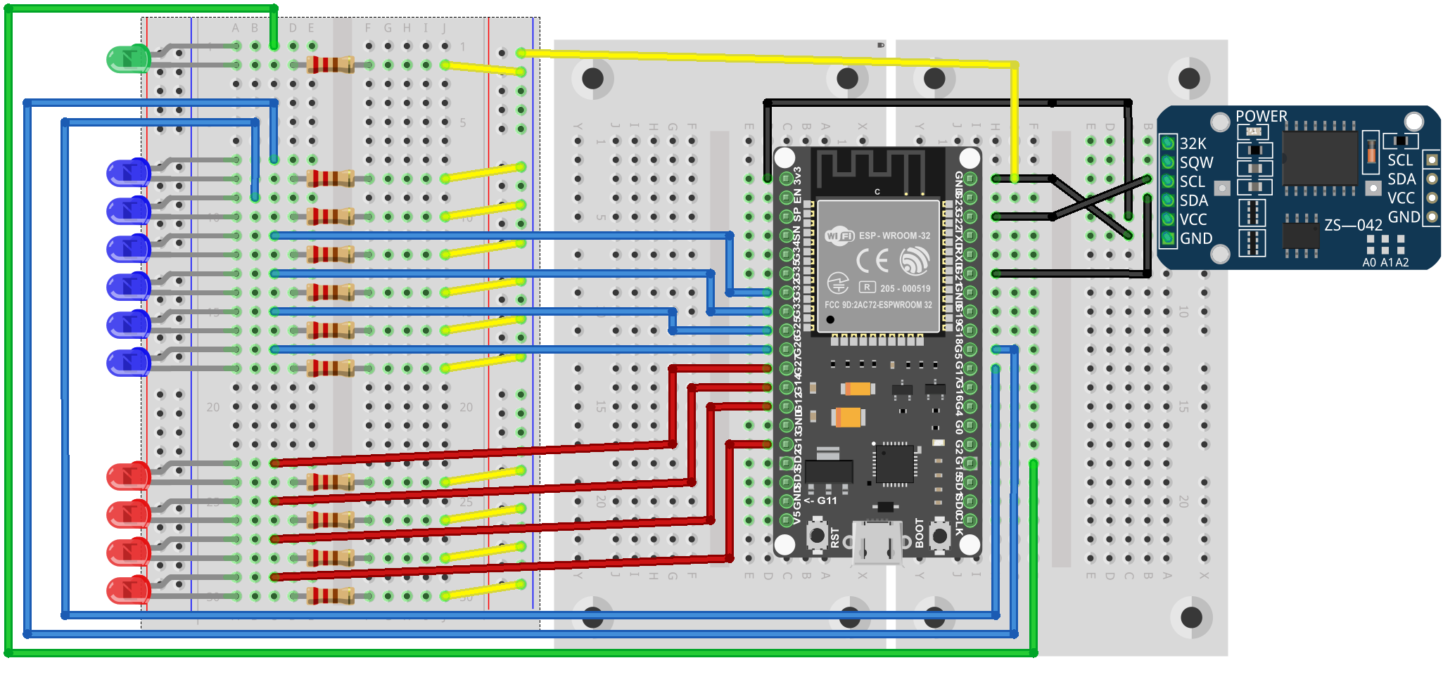 | Um die RTC verwenden zu können, müssen wir diese mit dem ESP32 verbinden. Das RTC-Modul hat die Anschlüsse 32K, SQW, SCL, SDA, VCC und GND. Die Anschlüsse 32K und SQW können wir ignorieren, da wir diese für die Binäruhr nicht benötigen. Die restlichen Anschlüsse werden so verkabelt: