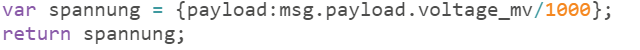 3. Die function Node übernimmt die ausgegebene Nachricht und gibt den Wert der gewünschten Größe aus. Die folgende Abbildung zeigt exemplarisch den notwendigen Code für die Spannung.